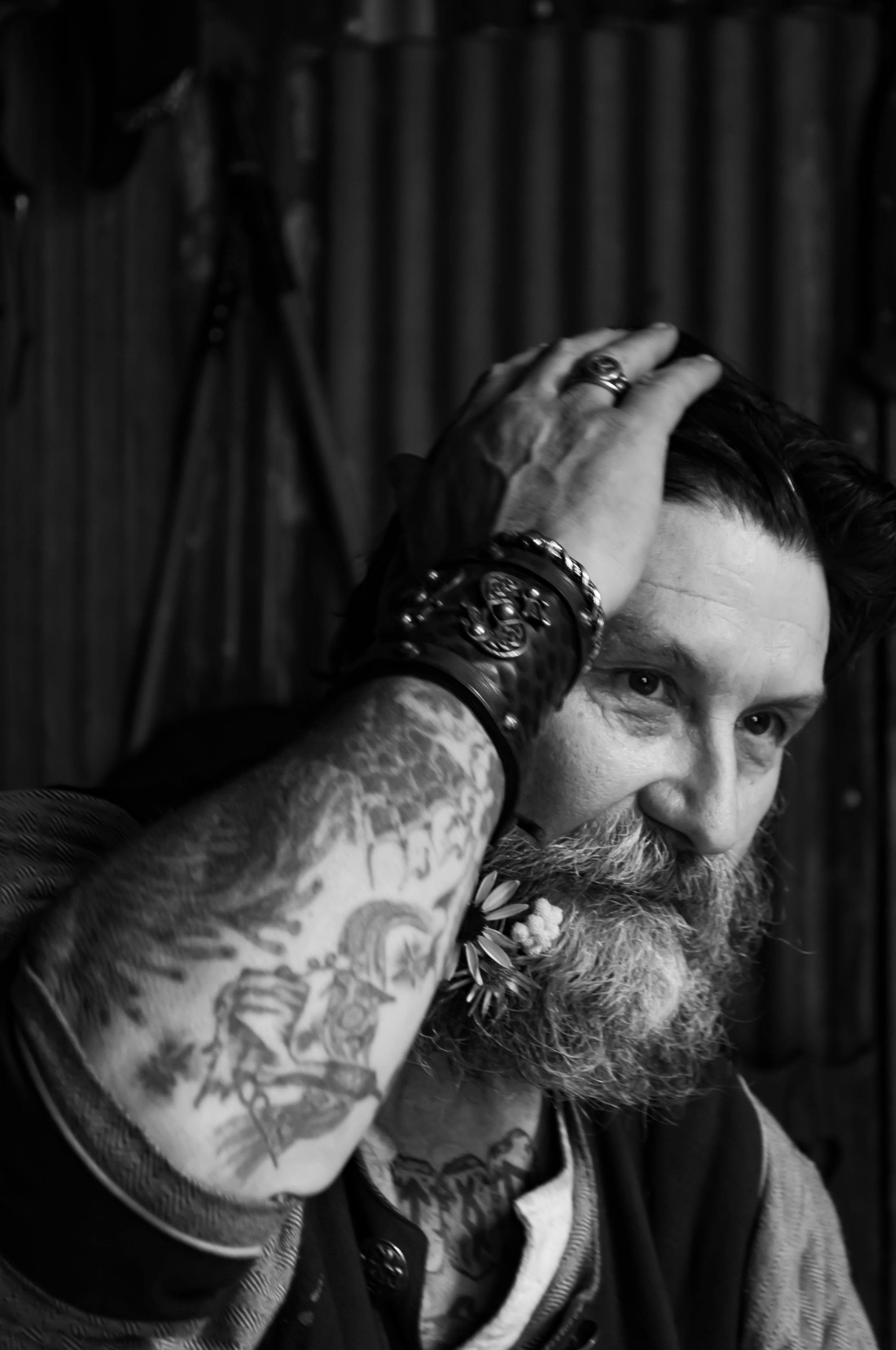 Dave, from Electric Ink Tattoo, plays a pivotal role in this artistic narrative. Known for his bold tattoo designs featuring Norse mythology, Dave is the central figure of this shoot. His intricate tattoos integrate seamlessly with the theme, enriched further by the floral elements that weave through his attire. These flowers do not undermine the warriors' intensity but rather, highlight their connection to the earth and the cycle of life and death—a theme deeply embedded in Viking culture.